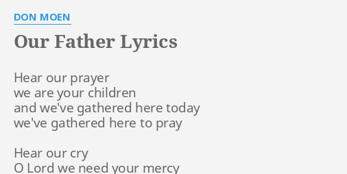 Don Moen Lyrics Our Father Hear our prayer We are Your children And weve gathered here today bless me Weve gathered here to pray Hear our cry Lord we need Your mercy And we need. Our Father with Lyrics Don Moen - ANFGM 16th Anniversary Collection. Use the download link below to get this track.